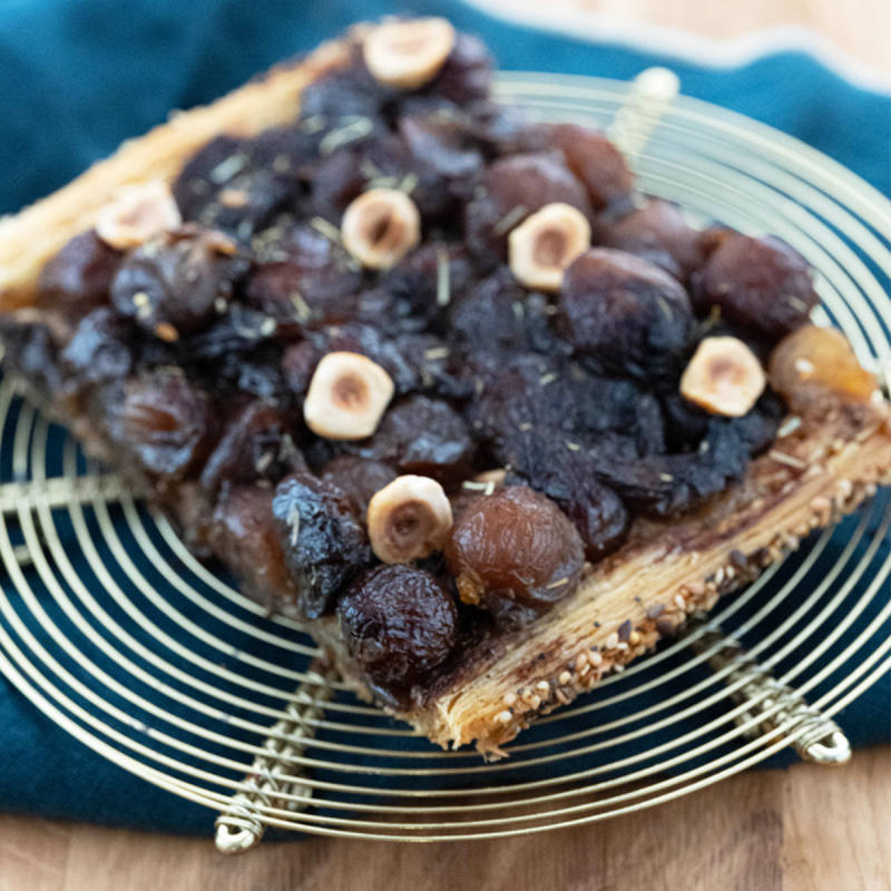 farine de BLE, oignon rouge (15%) , crème fraiche (crème pasteurisée (LAIT), ferments lactiques (LAIT)), comté (11%) (LAIT cru de vache, sel, ferments LACTIQUES, coagulant), emmental (LAIT pasteurisé de vache, sel, enzyme coagulante, ferments), eau, beurre (LAIT), graine de SESAME, LAIT demi écrémé stérilisé, OEUF, MOUTARDE de Dijon et MOUTARDE à l’ancienne (contient des SULFITES), sucre inverti, sucre, levure, ciboulette, sel, miel de forêt.