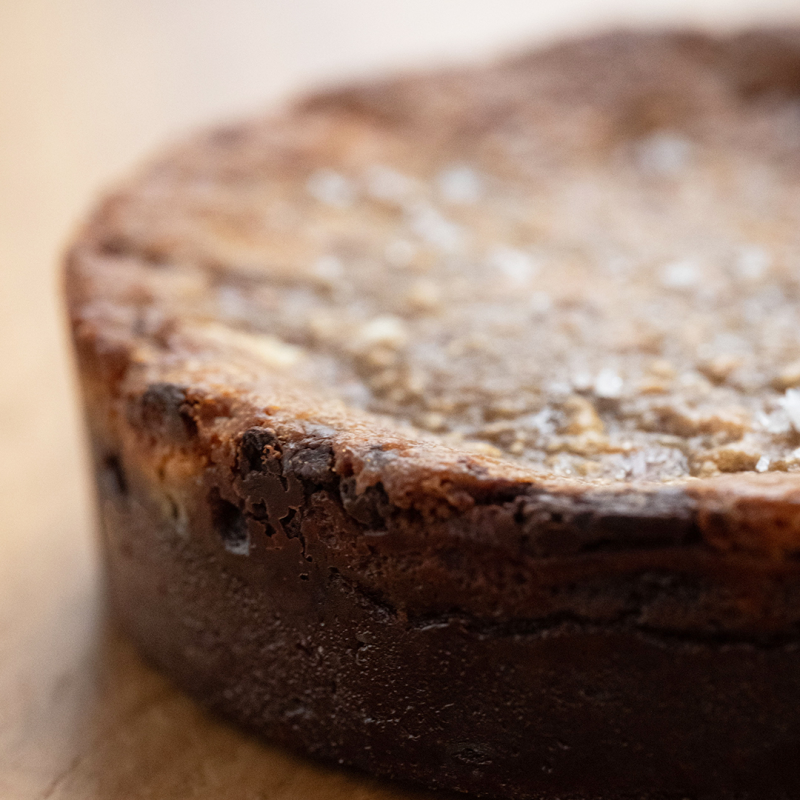 Fondant au chocolat noir recouvert d'une pâte à cookie aux chocolats noir, lait et blanc, fleur de sel.