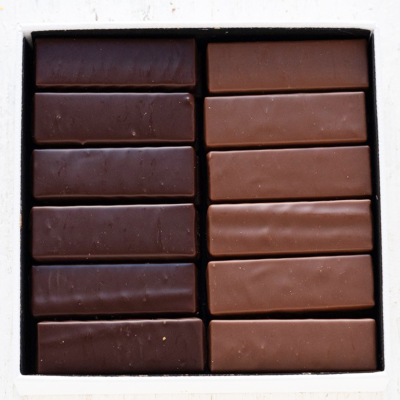 Ingrédients : chocolat noir cacao : 66% minimum (fèves de cacao, sucre, beurre de cacao, émulsifiant: lécithine de tournesol, extrait naturel de vanille), chocolat au lait (sucre, beurre de cacao, LAIT entier en poudre, fèves de cacao, sucre roux, LAIT écrémé en poudre, extrait naturel de vanille, émulsifiant: lécithine de tournesol, extrait malt d’ORGE, arôme naturel de vanille), chocolat blanc (sucre, beurre de cacao, LAIT entier en poudre, émulsifiant : lécithine de tournesol, extrait naturel de vanille), AMANDE 12%, sucre glace (sucre, amidon de pomme de terre), NOISETTE 7%, beurre de cacao, fleur de sel.