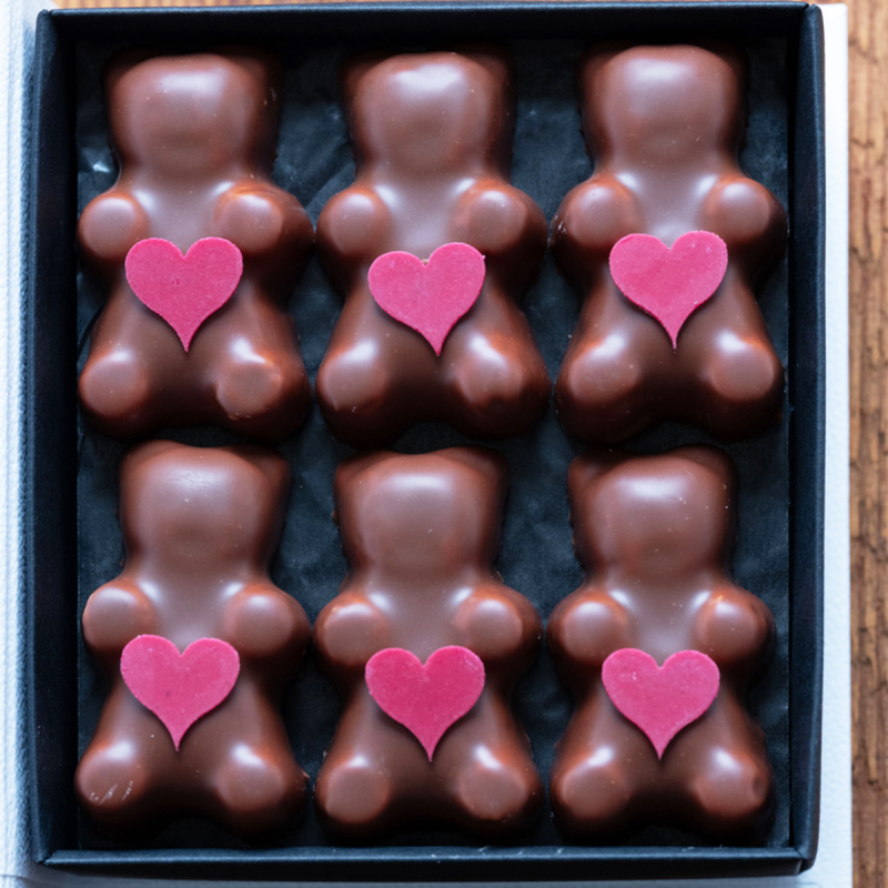 Coffret de 12 mini Oursons Guimauve parfumés à la rose et enrobés de chocolat au lait (40% de cacao minimum), petit décor en chocolat blanc en forme de coeur.