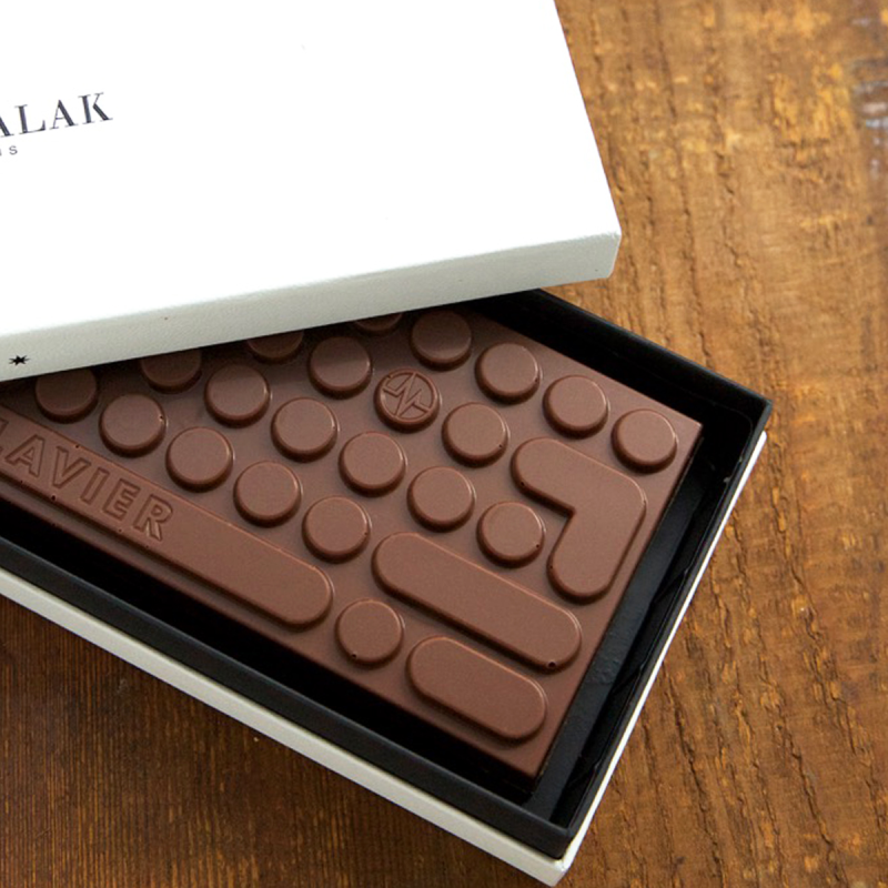 Chocolat au lait 40% de cacao, fourré praliné noisette et fleur de sel.