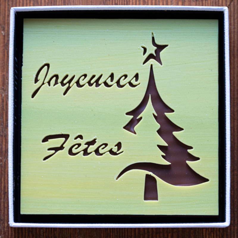 Tablette de chocolat lait garnie de praliné pistache et de kadaïf grillé, fine couche de chocolat blanc.
