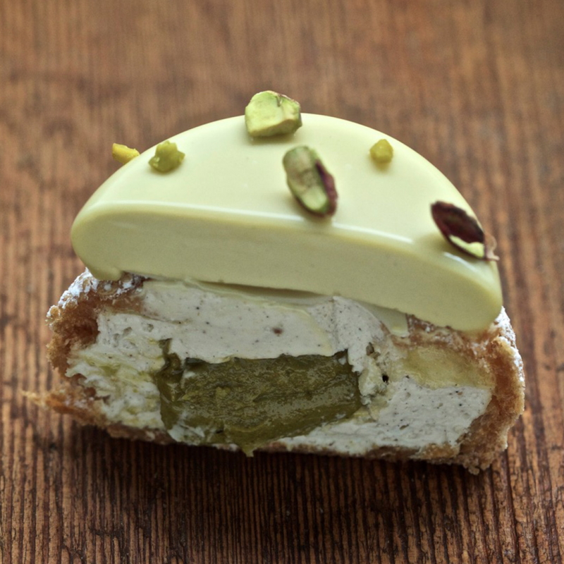 Pâte à choux, craquelin, crème légère à la vanille, praliné et crémeux pistache, fine feuille de chocolat blanc, pistaches grillées.